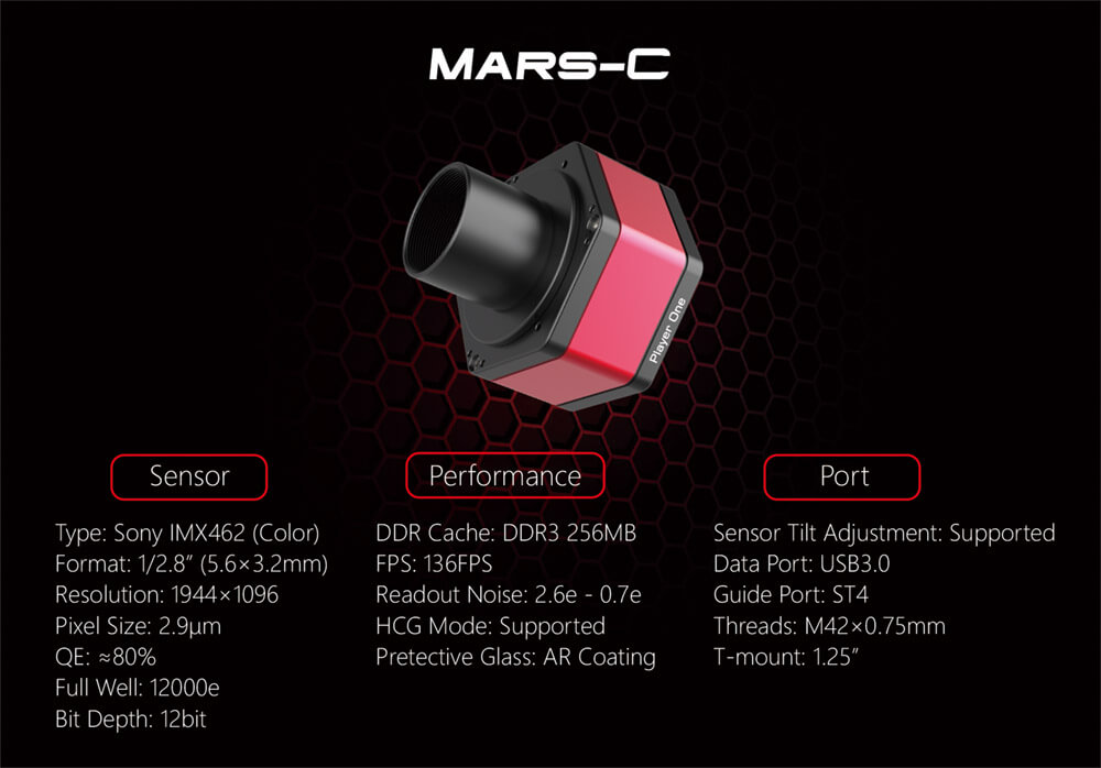 Player One Mars-C (SKU: POA-MARS-C) to kompaktowa kamera one-shot color przeznaczona do szybkiej fotografii Słońca, Księżyca i planet. Zastosowano czuły sensor Sony IMX462 COLOR (STARVIS, 1/2,8″), który łączy bardzo niski szum odczytu z wyjątkową czułością w bliskiej podczerwieni. Piksel 2,9 µm i rozdzielczość 1936 × 1096 px (2,1 MP) zapewniają prawidłowe próbkowanie przy ogniskowych 2000 – 5000 mm oraz duże prędkości odczytu – do 120 kl./s w pełnej rozdzielczości RAW 10. Bufor 256 MB DDR-III chroni przed zgubieniem klatek, a pasywny radiator PCS stabilizuje temperaturę sensora podczas długich serii lucky-imaging.
