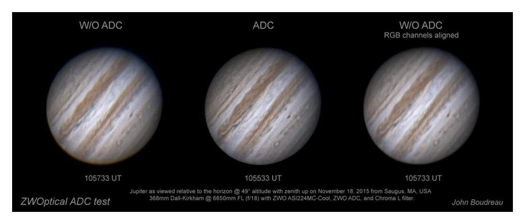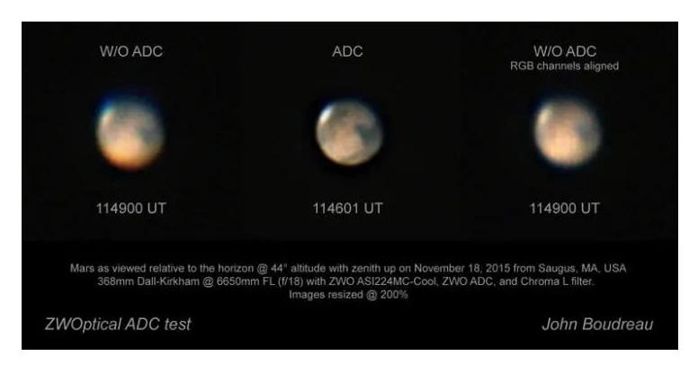 ZWO ADC (Atmospheric Dispersion Corrector) to korektor dyspersji atmosferycznej, zaprojektowany z myślą o poprawie jakości obrazów Księżyca i planet. Eliminując aberrację chromatyczną powodowaną przez atmosferę ziemską – szczególnie przy niskim położeniu obiektów nad horyzontem – pozwala uzyskać wyraźniejsze i ostrzejsze obrazy w astrofotografii. Urządzenie zostało wyróżnione tytułem „Hot Sky Product 2017” przez magazyn „Sky & Telescope”.