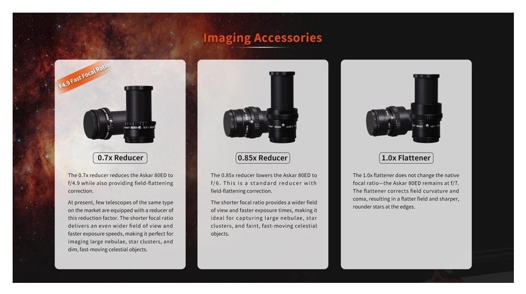 Teleskop Askar 80ED to instrument optyczny o średnicy apertury 80 mm, ogniskowej 560 mm oraz światłosile f/7. Układ optyczny oparty jest na dwuelementowej soczewce obiektywowej, w której zastosowano jedną soczewkę ze szkła ED oraz jedną ze standardowego szkła achromatycznego.
