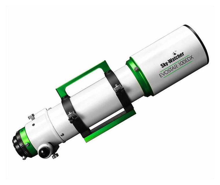 Teleskop apochromatyczny Sky-Watcher Evostar 100EDX to nowa wersja znanego refraktora ED 100 mm, która łączy w sobie zmienioną optykę o światłosile f/7 oraz szereg usprawnień mechanicznych. Dzięki zastosowaniu elementu FPL53 i szkła koronkowego Schott, obraz charakteryzuje się wysokim kontrastem i minimalną aberracją chromatyczną. Tuba została wyposażona w nowy, większy wyciąg Crayforda 2,8", rotację 360°, skalę ogniskowania oraz wysuwaną osłonę przeciwroszeniową.