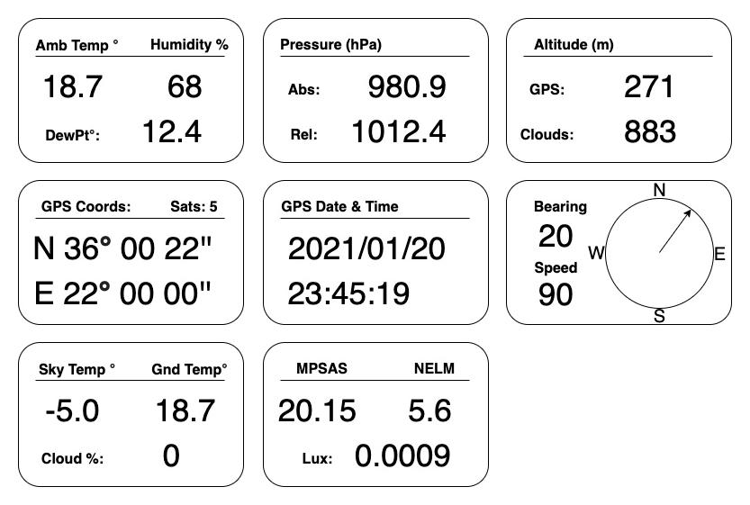 Czujnik mierzy i raportuje temperaturę otoczenia, wilgotność względną, punkt rosy, ciśnienie atmosferyczne (bezwzględne i przeliczone na poziom morza), wysokość barometryczną i GPS, stopień zachmurzenia, temperaturę nieba, wysokość chmur, jasność nocnego nieba oraz parametry astronomiczne, takie jak faza i wiek Księżyca oraz czas zmierzchu astronomicznego. Wszystkie dane są prezentowane bezpośrednio na wbudowanym czerwonym wyświetlaczu w postaci czytelnych menu.