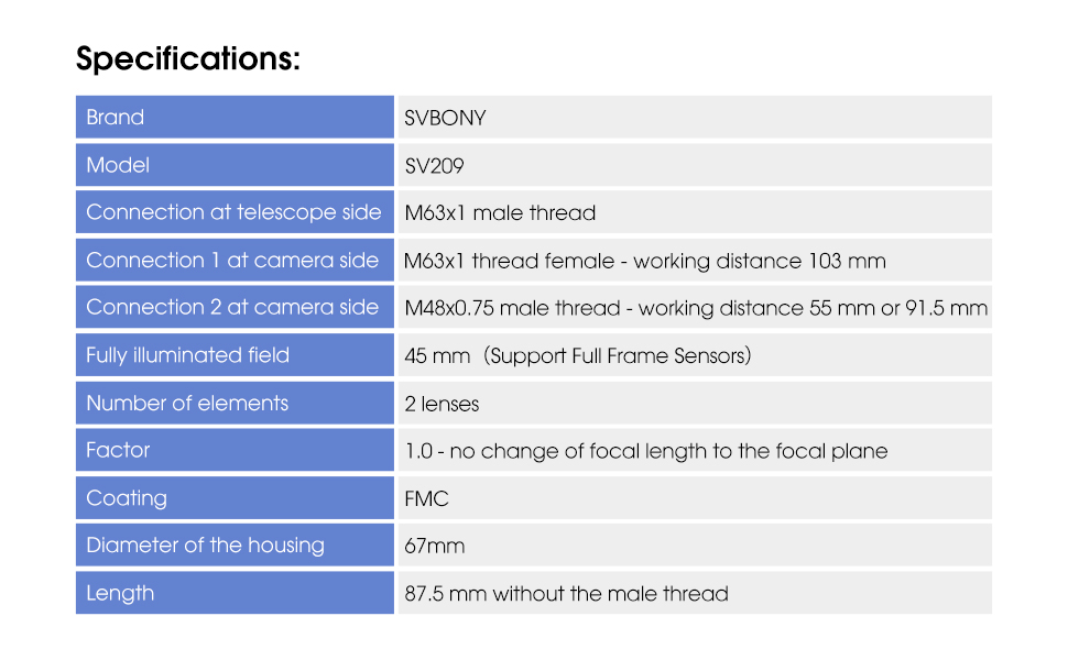 • flattener dedykowany do teleskopu SVBONY SV503 ED 102 mm