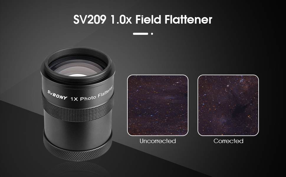 SVBONY SV209 1,0x to dedykowane akcesorium do teleskopu SVBONY SV550 80 mm F/6. Flattener ten umożliwia idealne skorygowanie krzywizny pola, co w diametralny sposób przekłada się na jakość ujęć astrofotograficznych.