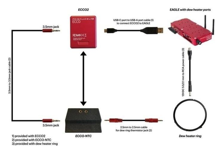 Adapter ECCO-NTC do Dew Heater Rings (PrimaLuceLab, SKU: PL1000061) umożliwia współpracę kontrolera środowiskowego ECCO 2 z pierścieniami grzewczymi Celestron Dew Heater Ring, które wykorzystują czujnik NTC do pomiaru temperatury korektora. Dzięki temu sterownik może automatycznie regulować moc grzałki bez dodatkowej sondy.