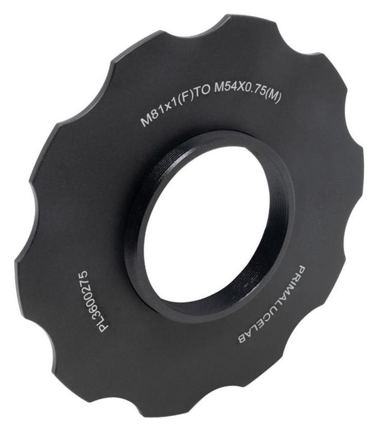 Adapter M81 → M54 (female) z pierścieniem stop dla ESATTO 3" / ARCO 3" (PrimaLuceLab, SKU: PL3600275) umożliwia podłączenie akcesoriów z gwintem zewnętrznym M54 × 0,75 (np. koła filtrowego, przejściówek, kamer) do wyciągu ESATTO 3" lub rotatora ARCO 3", które posiadają frontowy gwint M81 × 1. Zintegrowany pierścień kontrujący (stop-ring) pozwala precyzyjnie ustawić głębokość wkręcenia adaptera i zablokować go w wybranej pozycji, co ułatwia kontrolę back-focusu i orientację przyłączonego urządzenia.