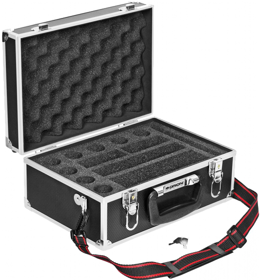Walizka z ABS do przechowywania i transportu okularów astronomicznych 1,25" oraz akcesoriów astronomicznych (złączek, Barlowa etc). Wyposażona w wypełnienie z piankowe oraz odpowiednie otwory gotowe do włożenia posiadanych "szkiełek".