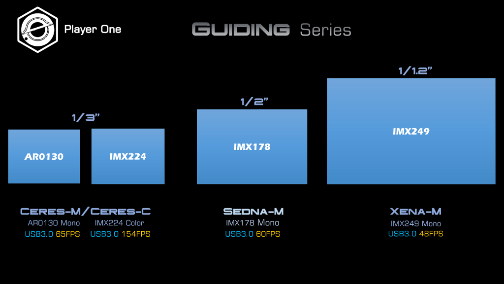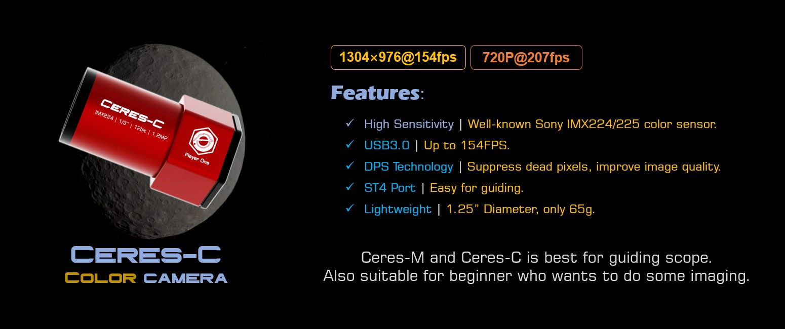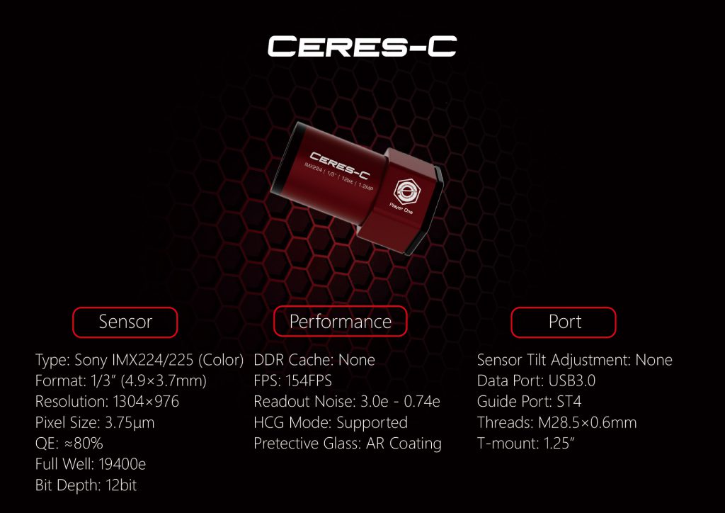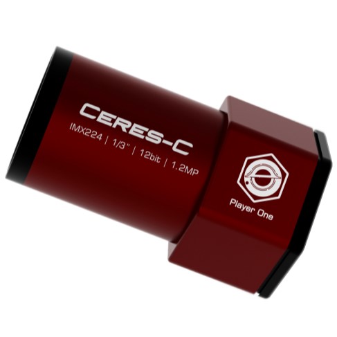 Player One CERES-C Color (SKU: POA-CERES-C) to ekstremalnie lekka i szybka kamera one-shot color stworzona z myślą o guidowaniu, fotometrii gwiazd zmiennych oraz rejestracji planet, Księżyca i przelotów ISS. Sercem kamery jest ceniony sensor Sony IMX224 COLOR (1/3″, 1,27 MP), łączący bardzo niski szum odczytu z wysoką czułością kwantową (≈77 %) – także w bliskiej podczerwieni. Elektronika USB 3.0 i bufor 256 MB DDR-III umożliwiają zapis do 150 kl./s w pełnej rozdzielczości RAW10 bez gubienia klatek.