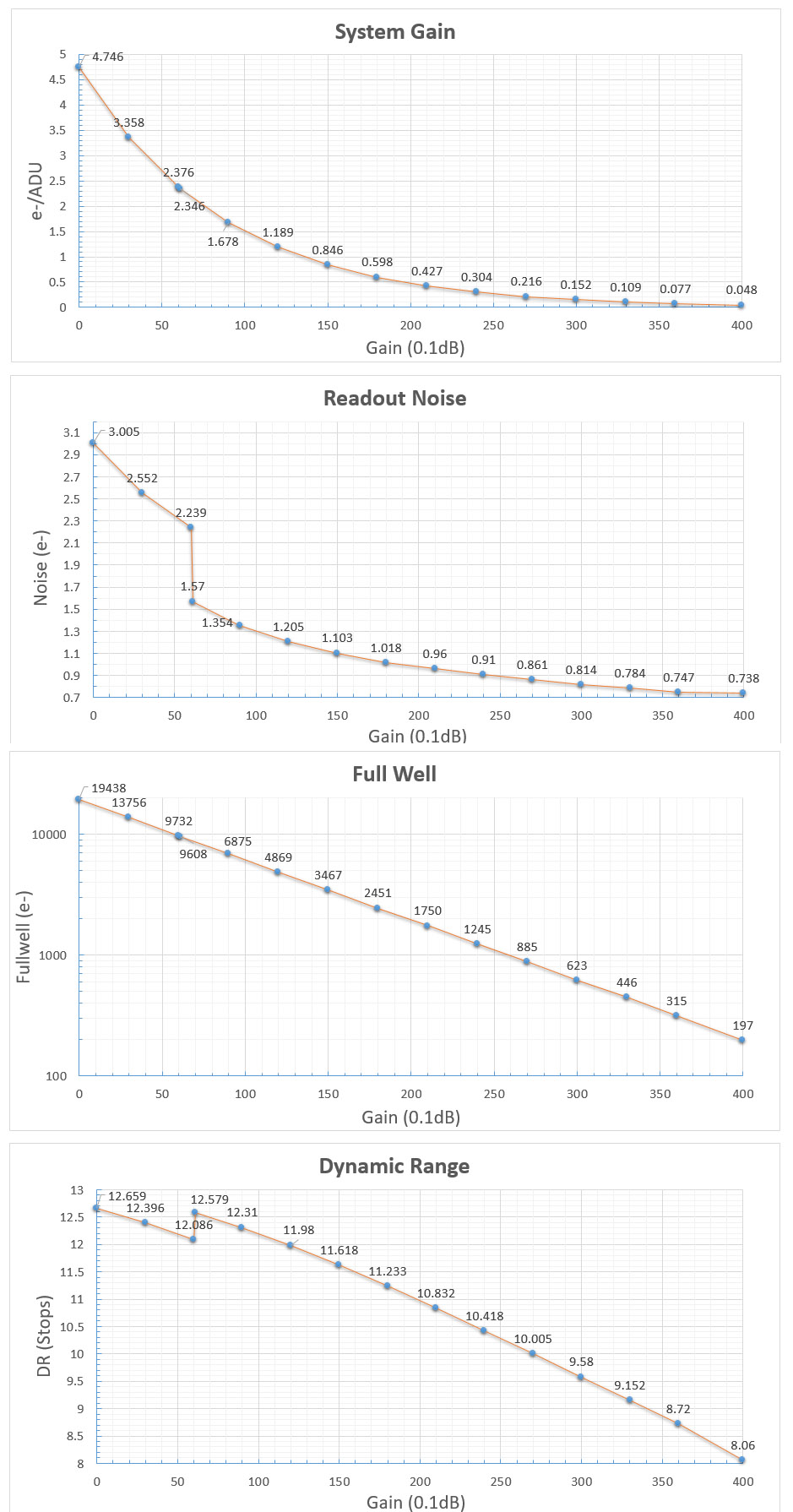 • szum odczytu: 0,7 – 2,5 e- (HCG → LG)