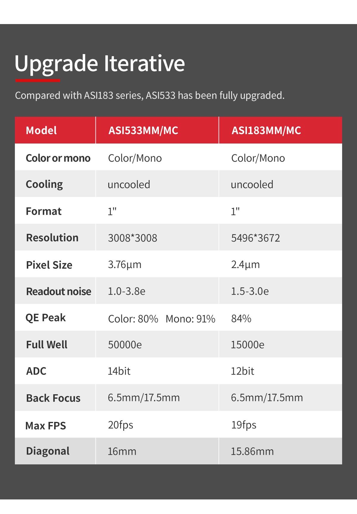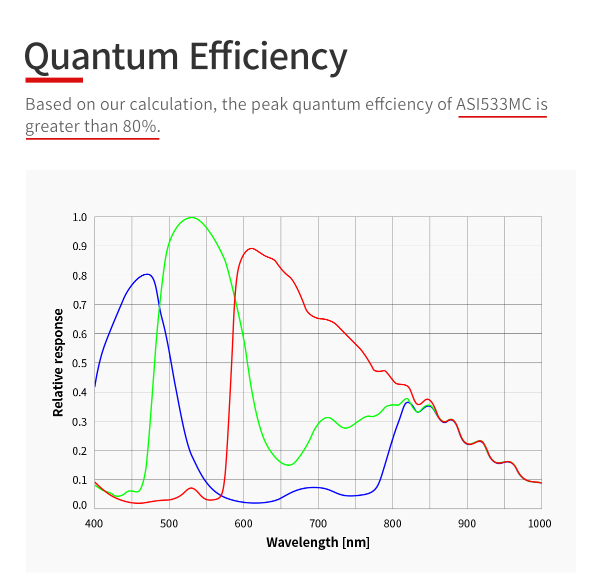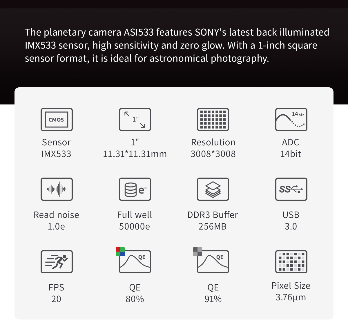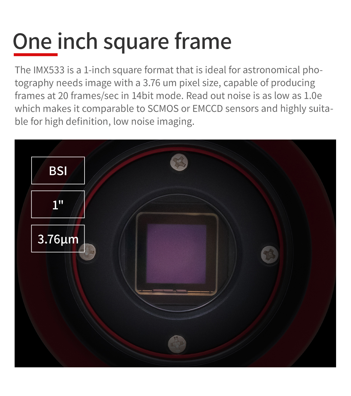 Wykorzystanie sensora Sony IMX533 zbudowanego w technologii Sony Starvis™ uzyskano niespotykaną do tej pory czułość, która pozwoli rejestrować słaby sygnał pochodzący nawet od najdalszych obiektów dalekiego kosmosu. Produkt ten wolny jest także od efektu Amp Glow charakterystycznego dla wielu matryc CMOS, objawiającego się rozjaśnieniem pewnych części obrazu podczas długich ekspozycji. Pomimo braku aktywnego chłodzenia, kamera charakteryzuje się niezwykle niskim poziomem szumu odczytowego, mieszczącym się w zakresie 1 do 3,8 e.
