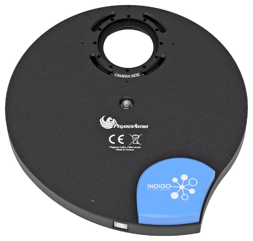 Indigo Filter Wheel zasilane i sterowane jest wyłącznie jednym przewodem USB2 (Typ B), co eliminuje konieczność stosowania dodatkowego zasilacza i upraszcza okablowanie przy montażu. Oba gwinty M54 (od strony teleskopu i kamery) wyposażono w adaptery z regulacją orientacji, umożliwiające precyzyjne ustawienie rotacji kamery lub akcesoriów bez ingerencji w resztę zestawu.