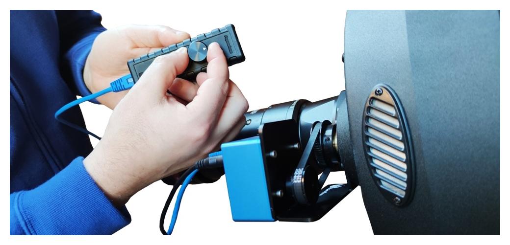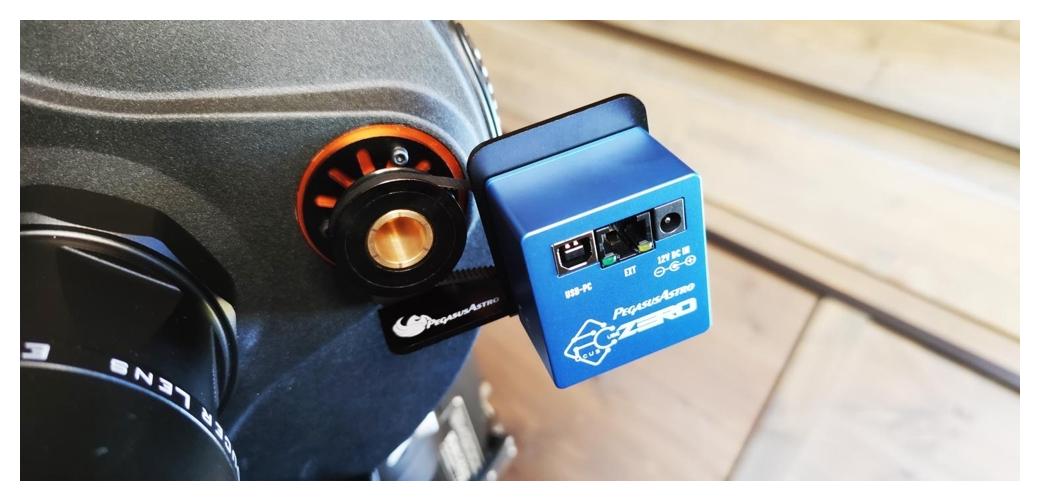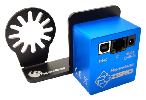 FocusCube Zero jest urządzeniem typu standalone i posiada wbudowany kontroler – nie wymaga żadnych zewnętrznych sterowników ani kontrolerów silników. Sterowanie odbywa się przez USB z poziomu komputera, przy użyciu sterowników ASCOM lub oprogramowania Pegasus Astro Unity Platform. Port RJ45 znajdujący się z tyłu obudowy służy wyłącznie do podłączenia opcjonalnego kontrolera ręcznego lub dołączonego czujnika temperatury i nie może być wykorzystywany do podłączania innych kontrolerów silników.