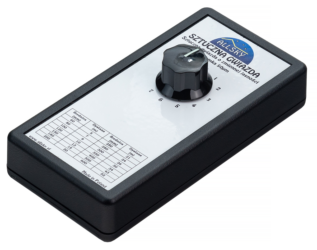 There is a table on the housing of the device that allows you to set an artificial star at an appropriate distance, depending on the aperture of the telescope. • spot diameter 9 µm • white light with adjustable brightness • spot diameter: 9 µm • light color: white • brightness control: yes • power supply: 9 V battery • 60 mm - 1 m • 80 mm - 1 m • 100 mm - 2 m • 120 mm - 2 m • 150 mm - 2 m • 180 mm - 3 m • 200 mm - 3 m • 250 mm - 4 m • 280 mm - 4 m • 300 mm - 5 m • 350 mm - 6 m • 400 mm - 7 m • 500 mm - 8 m • 600 mm - 10 m • 9 µm Allsky artificial star 24 months (note, below pictures of the 50 um version)