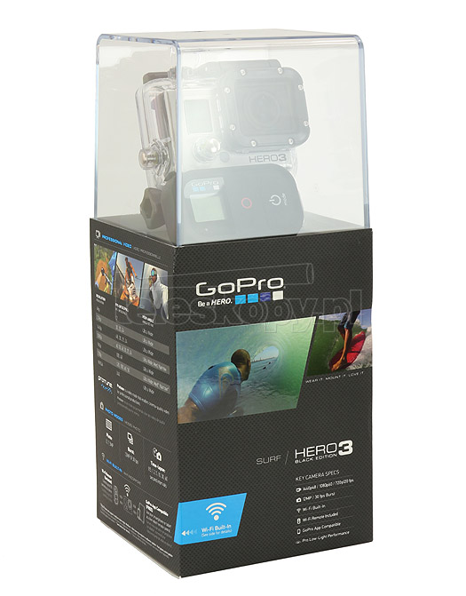 Wersja SURF kamery HD Hero3 BLACK, dedykowana do sportów wodnych; różni się od wersji "zwykłej" obecnością 1 zestaw mocowań SUFR BOARD MOUNT zamiast 1 x CURVED ADHESIVE MOUNT i 1 x FLAT ADHESIVE MOUNT. Pozostałe elementy wyposażenia oraz specyfikacje są identyczne