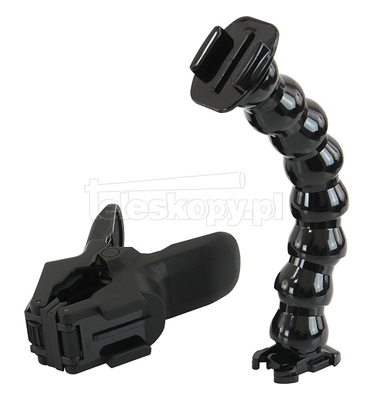 Mocowanie szczękowe pozwala na pewne i szybkie przymocowanie kamery tam, gdzie tego potrzebujemy. Dodatkowo w zestawie znajduje się elastyczne ramię o długości 18 cm umożliwiające ustawienie kamery pod odpowiednim kątem.