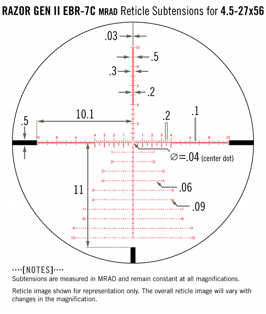 Podświetlenie krzyża - profesjonalne stopniowanie podświetlenia: zaprojektowane do pracy w dzień, przy słabym świetle oraz z urządzeniami do noktowizji. Najwyższe ustawienie (11) umożliwia optymalną widoczność w dzień, w zależności od koloru tła. Ustawienia poniżej 11 pomagają w sytuacjach słabego oświetlenia, kiedy oko się dostosowało. Niższe ustawienia są użyteczne w przypadku stosowania urządzenia z noktowizorami.