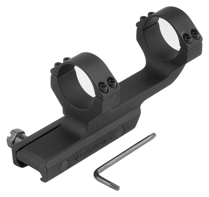 Montaż jednoczęściowy do lunety optycznej od Vector Optics to prosty i solidny sposób montażu optyki na standardowej szynie Picatinny. Wykonany w całości z anodowanego aluminium 6061-T6, frezowanego metodą CNC, charakteryzuje się wysoką precyzją wykonania, lekkością oraz dużą odpornością na odrzut broni. Montaż mocowany jest dwoma śrubami z podkładkami sprężynującymi, a obejmy zakręcane są czterema śrubami, zapewniając pewny chwyt lunety o średnicy tubusu do 30 mm. Odległość między pierścieniami wynosi 64 mm. Profil montażu jest wysoki (38 mm), a konstrukcja w stylu Tactical Offset umożliwia wygodne zamontowanie lunety na karabinkach AR, zapewniając odpowiedni dystans między okularem a okiem strzelca.