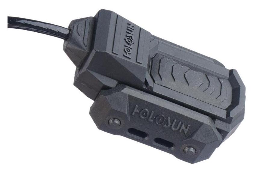 Laserowy wskaźnik celu Holosun IRIS IR to kompaktowy moduł montowany na szynie Picatinny za pomocą szczęk zaciskanych na śrubę. Urządzenie oferuje dwa tryby pracy lasera w podczerwieni (Low i High), wybierane przełącznikiem, a włączanie odbywa się za pomocą centralnego gumowanego przycisku lub dołączonego żelowego przełącznika taktycznego na kablu. Dzięki temu obsługa jest wygodna zarówno dla osób prawo-, jak i leworęcznych.