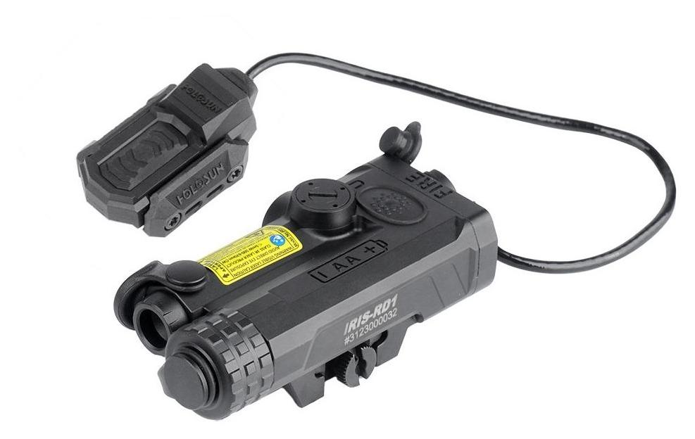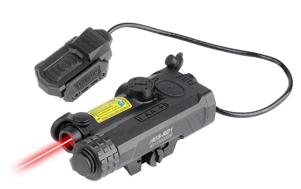 Laserowy wskaźnik celu Holosun IRIS to kompaktowy moduł montowany na szynie Picatinny za pomocą szczęk zaciskanych na śrubę. Urządzenie oferuje dwa tryby pracy lasera (Low i High) z możliwością regulacji intensywności wiązki. Włączanie odbywa się poprzez centralny gumowany przycisk lub dołączony żelowy przełącznik taktyczny na kablu, który można zamocować w dogodnym miejscu na broni.