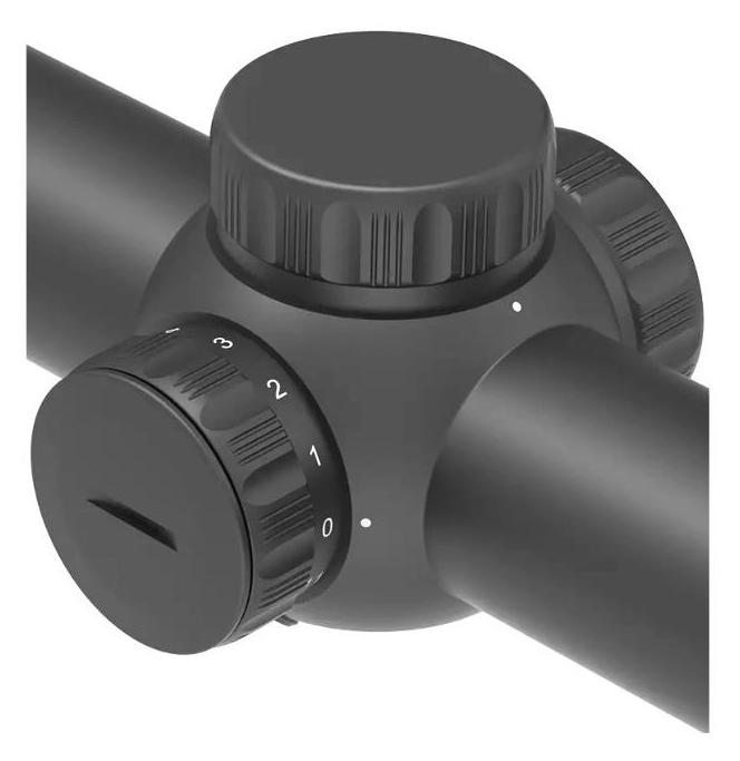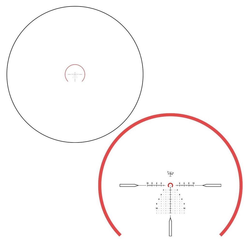 Luneta posiada podświetlany znak celowniczy VCO-2 MIL osadzony na pierwszym planie ogniskowym (FFP), co zapewnia skalowanie siatki wraz z powiększeniem i precyzyjne celowanie w jednostkach MIL. Regulację celownika umożliwiają wieżyczki z nakrętkami zabezpieczającymi, z zakresem regulacji około 35 MIL w pionie i poziomie oraz klikami co 1/10 MIL.