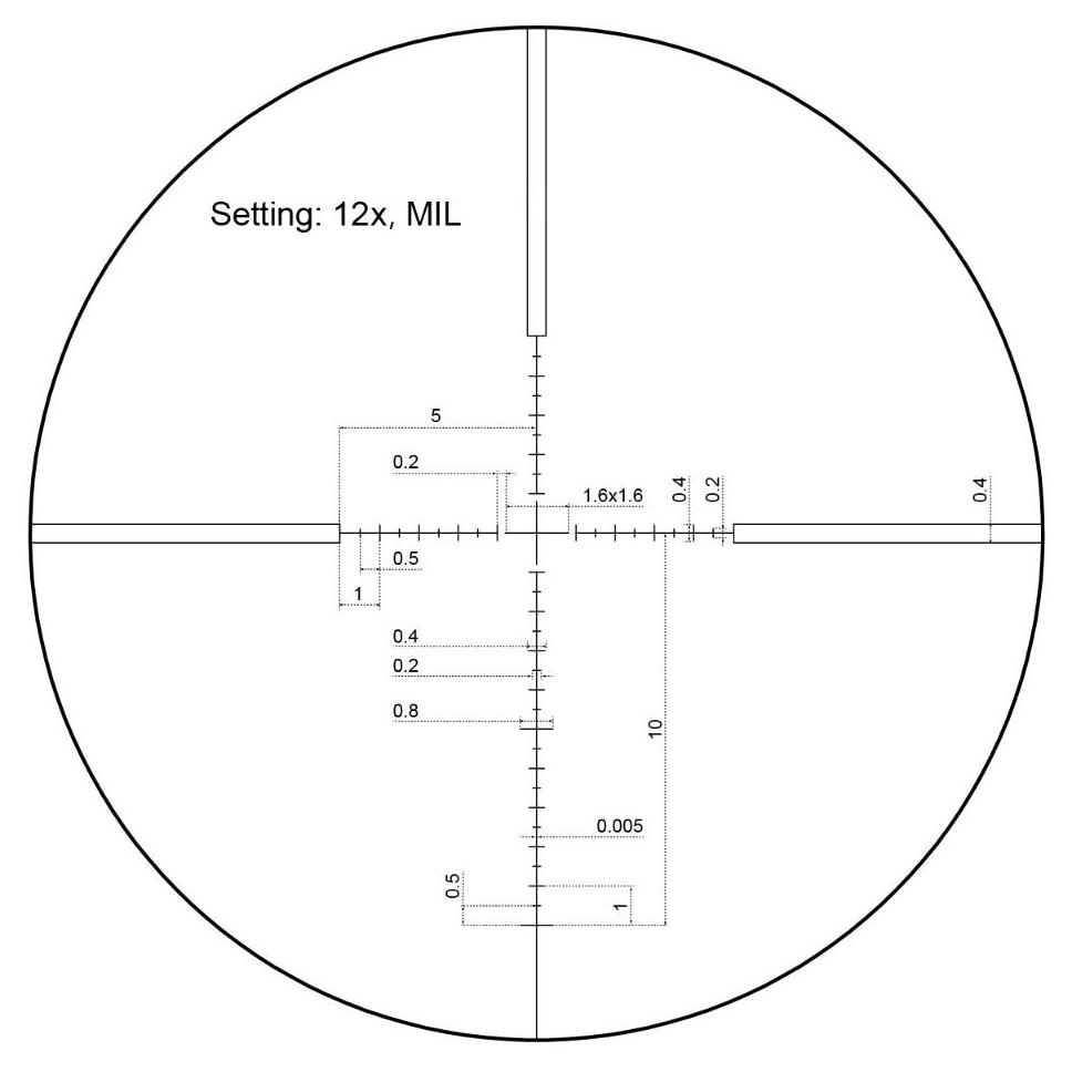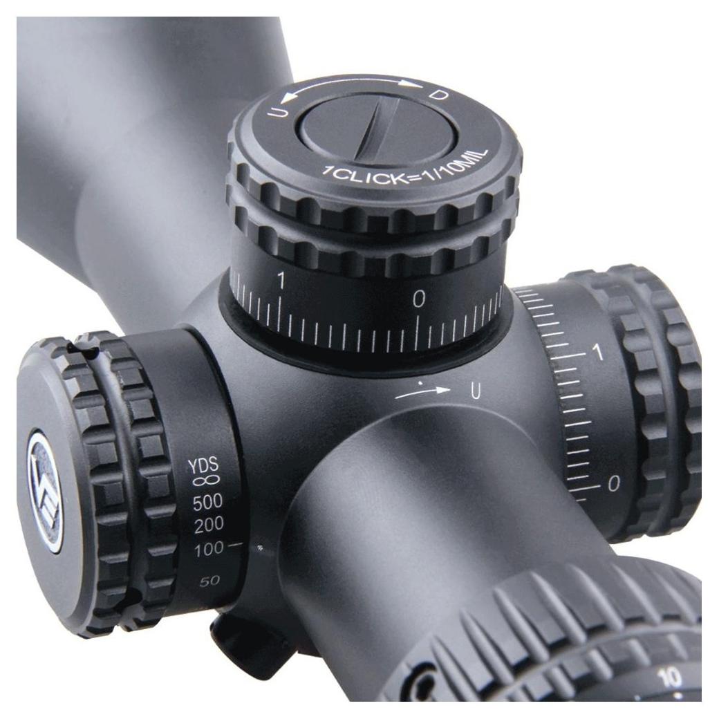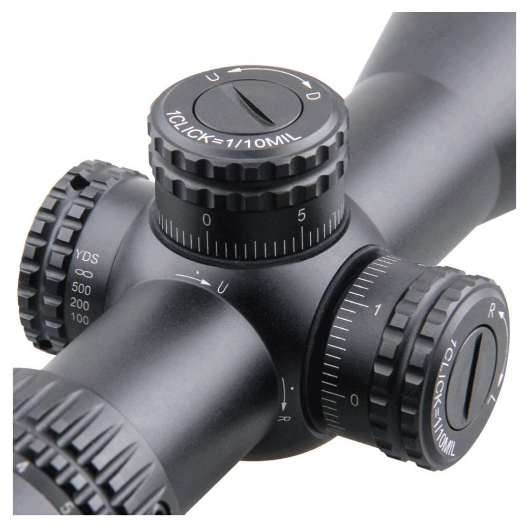 Luneta wyposażona jest w siatkę celowniczą MPR-4 osadzoną na drugim planie (SFP), która umożliwia ocenę odległości do celu oraz manualną korektę opadu pocisku, co pozwala na celne strzały nawet bez dodatkowych regulacji. Wieżyczki regulacyjne z blokadą umieszczono na bocznej i górnej części tubusu, oferując zakres regulacji do 17,5 MIL w pionie i poziomie z klikami co 1/10 MIL.