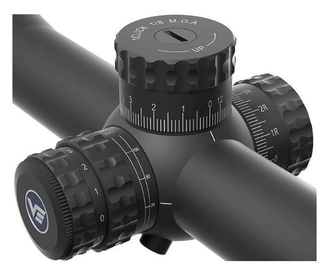 Regulacja wieżyczek odbywa się z dokładnością 1/8 MOA, a zakres regulacji wynosi +/- 50 MOA zarówno w pionie, jak i poziomie. Wieżyczka pionowa posiada funkcję zero-stop, ułatwiającą szybki powrót do ustawień zerowych. Paralaksa korygowana jest bocznym pokrętłem w zakresie od 9 m (10 jardów) do nieskończoności.