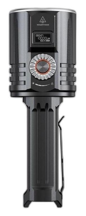 Obrotowy przełącznik z funkcją blokady umożliwia precyzyjne dopasowanie intensywności światła do aktualnych potrzeb. Wyświetlacz OLED umieszczony nad włącznikiem na bieżąco prezentuje kluczowe informacje o pracy latarki.