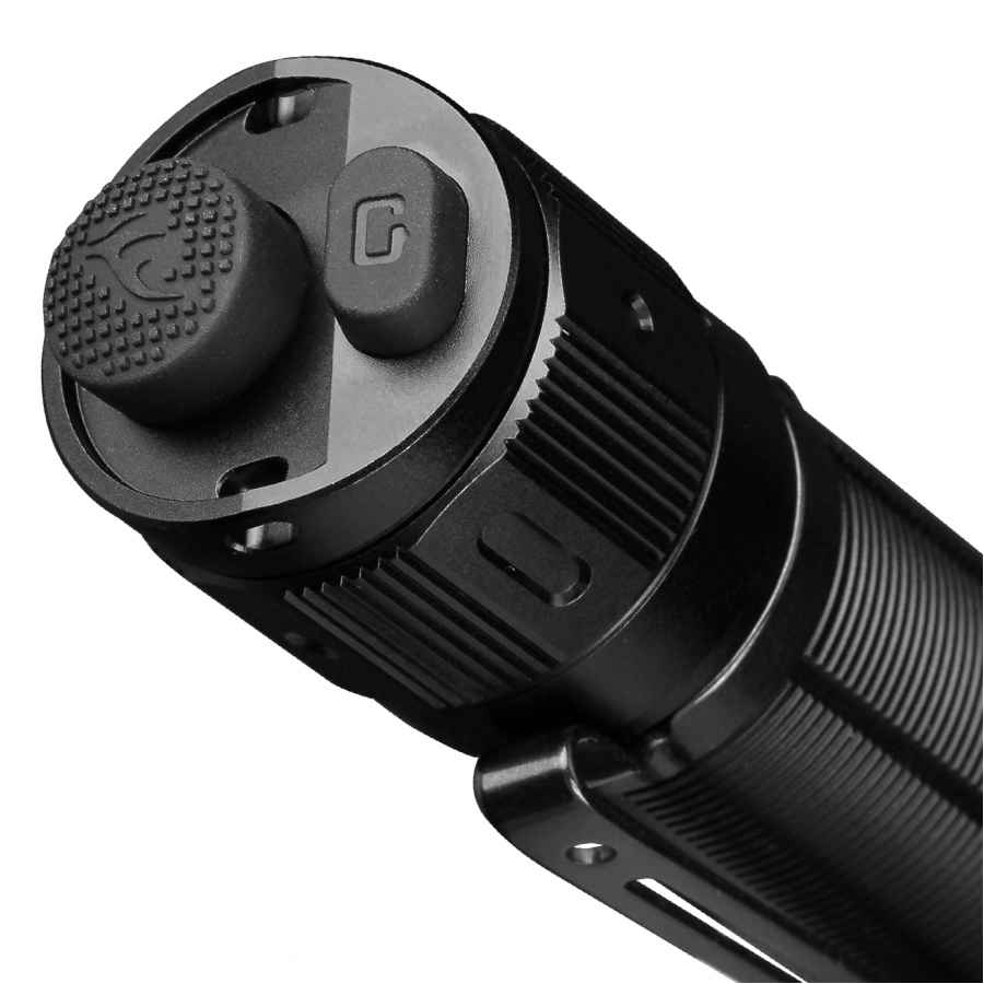 Do sterowania latarką służą 2 tylne włączniki: przycisk taktyczny odpowiedzialny za aktywację światła chwilowego i włączanie/ wyłączanie latarki, oraz mniejszy przycisk funkcyjny służący do zmiany trybów światła białego stałego, oraz włączanie stroboskopu.