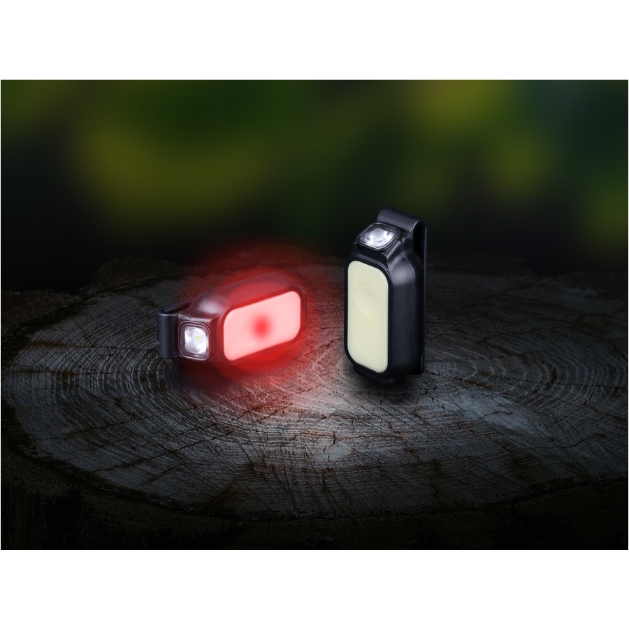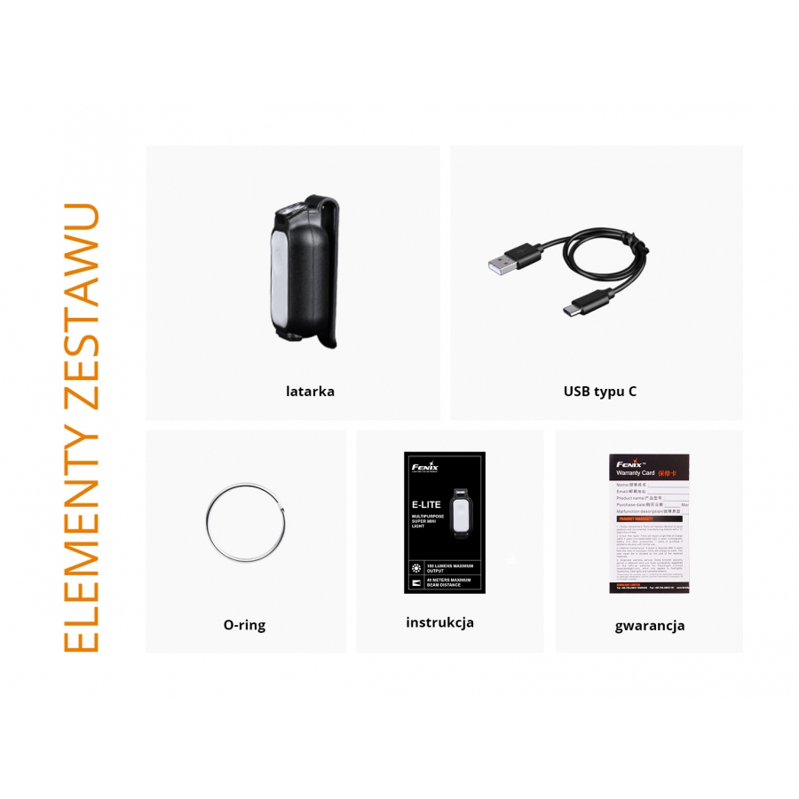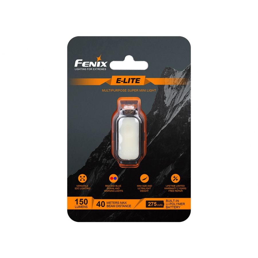 The presented parameters were obtained in laboratory conditions. During the tests, the Fenix ARB-L18 18650 3400 mAh 3.6 V battery was used. • number of modes: 8 • maximum working time: 300 hours • maximum luminous flux: 1400 lm • maximum range: 140 m • tightness class: IP68 • material: magnesium alloy • drop resistance: yes, up to 1 meter • power supply: ARB-L18-3400 3400 mAh battery • connector: USB-C • weight: 97 g • HM65R flashlight • ARB-L18-3400 3400 mAh battery • USB-C cable • set of seals • double head strap Fenix E-LITE ultralight outdoor flashlight with 3 light colors, equipped with an integrated mounting clip, USB-C charging port and a housing resistant to weather conditions. • versatile EDC flashlight • compact size and ultra-light weight • white MATCH CA18 LED, red and blue Everlight 2835 • built-in 275 mAh lithium-polymer battery • red and blue signaling and warning lights • electronic lock prevents accidental activation The flashlight is equipped with a strong clip that allows the light to be attached to a cap, pocket, backpack, bicycle, and also carried on a belt or chest. Fenix E-LITE is 52 mm long and weighs only 18 g, making it easy to forget about. The front flashlight diode emits a stream of 150 lumens. This efficient light is perfect for everyday use, both in and out of the city.