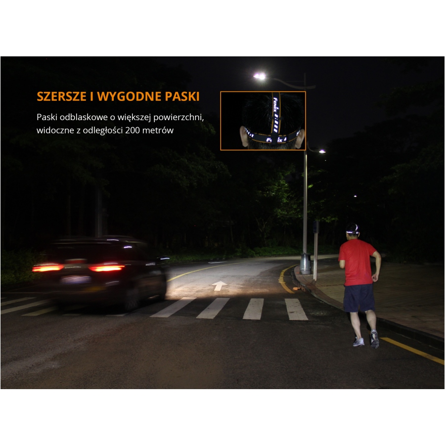 Convenient carrying of the flashlight on the head is ensured by a modernized rubber band, draining sweat and equipped with reflective inserts increasing our visibility and safety when moving at night on the road or trail.