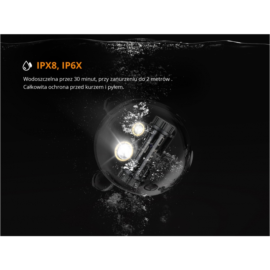 The flashlight has a high IP68 protection class, which means that it is resistant to dust, heavy rain, and even full immersion in water (2 m) for 30 minutes. Therefore, the HM65R can be successfully used in all weather conditions, practically for any physical activity.