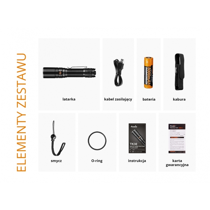 • elementy zestawu latarki: akumulator Fenix ARB-L21-5000 21700 5000 mAh, instrukcja producenta, kabel USB, krótka opaska na rękę (smyczka) (lanyard), pokrowiec (kabura) (holster), zapasowy o-ring ×1 (zapasowa uszczelka)