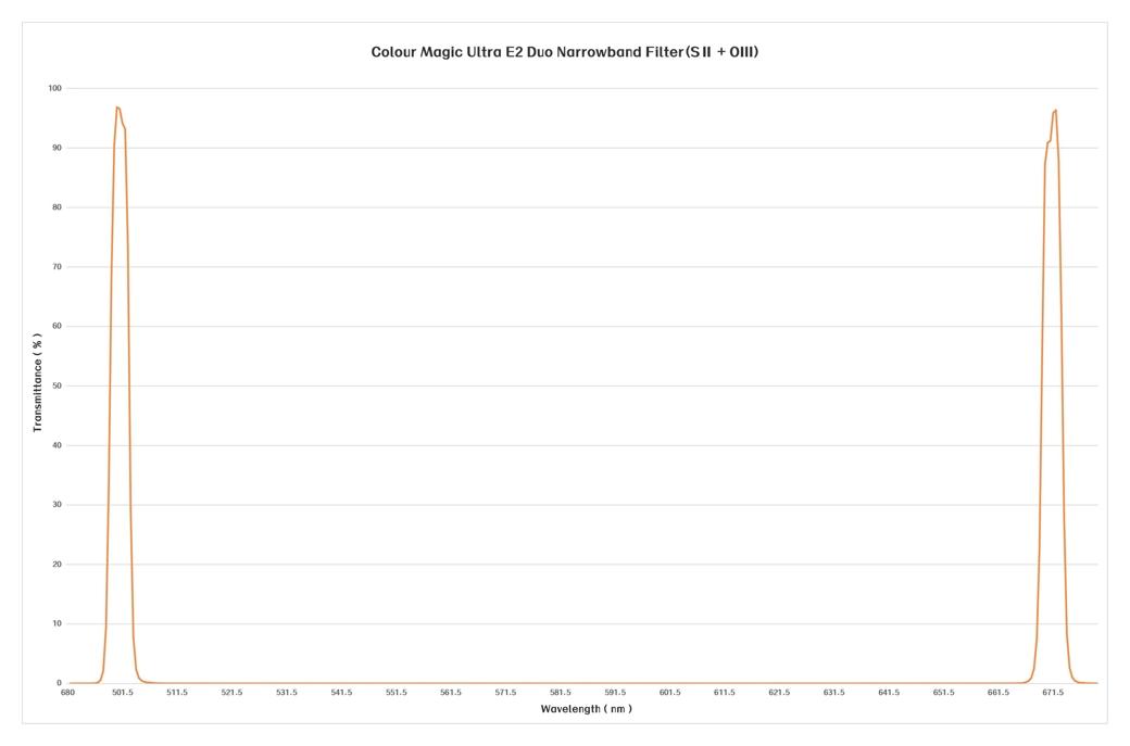 Askar ColourMagic Ultra E2 2" Duo-narrowband Filter (S-II + O-III) to specjalistyczny filtr wąskopasmowy zaprojektowany do obrazowania głębokiego nieba za pomocą kamer kolorowych. Łączy ultrawąskie pasmo S II 672 nm i O-III 500,7 nm, umożliwiając rejestrację emisji siarki oraz tlenu w jednym ujęciu — doskonałe uzupełnienie popularnego filtra H α + O III. Unikalna technologia „Ultra” minimalizuje powstawanie refleksów (halo): jedno pasmo ma szerokość 3,7 nm, drugie 4 nm, co przekłada się na wysoki kontrast i skuteczne tłumienie świateł miejskich.