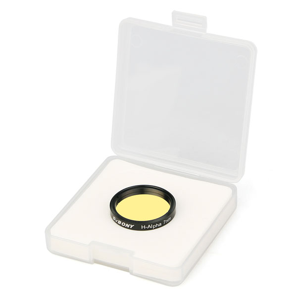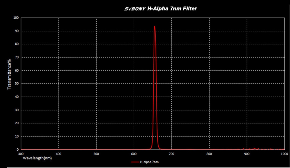 SVBONY Hα 2" 7 nm to profesjonalny filtr astrofotograficzny o szerokości połówkowej okna transmisyjności (FWHM) wynoszącej 7 nm. Przepuszcza on czerwone światło o długości fali 656,3 nm emitowane przez zjonizowane atomy wodoru, którego rejestracja ma szczególnie duże znaczenie przy fotografowaniu mgławic emisyjnych.