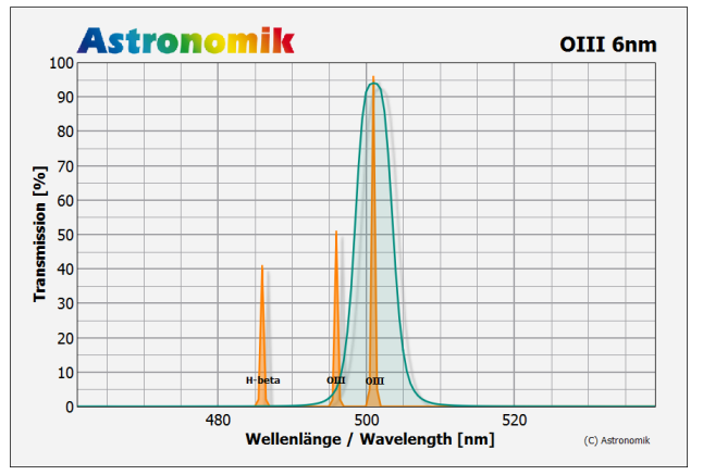 Wąska szerokość pasma 6 nm eliminuje niepożądane światło innych długości fal – od ultrafioletu aż po podczerwień – pozostawiając jedynie wybrane linie emisyjne tlenu. Filtr jest szczególnie polecany do fotografowania słabych obiektów w gęstych obszarach Drogi Mlecznej oraz w miejscach o bardzo silnym zanieczyszczeniu świetlnym.