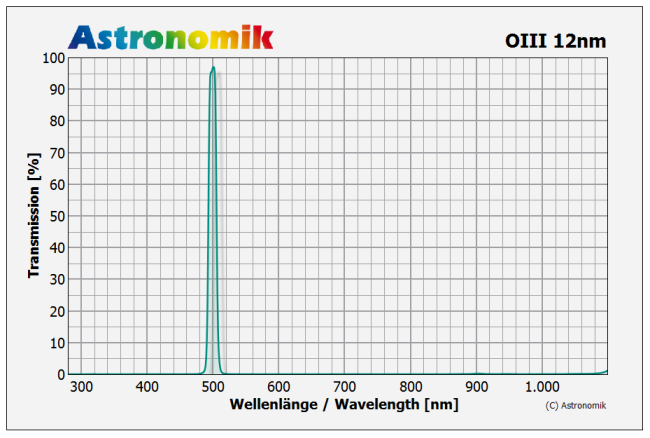 Filtr Astronomik OIII 12nm CCD to wąskopasmowy filtr przeznaczony do astrofotografii mgławic emisyjnych świecących w liniach tlenu (496 i 501 nm). Skutecznie zwiększa kontrast między obiektami emitującymi światło w tym zakresie widma a tłem nieba, nawet w warunkach silnego zanieczyszczenia świetlnego lub przy jasnym Księżycu. Filtr blokuje linie emisji lamp sodowych (niskiego i wysokiego ciśnienia), rtęciowych, naturalnego blasku nieba oraz większość światła księżycowego.
