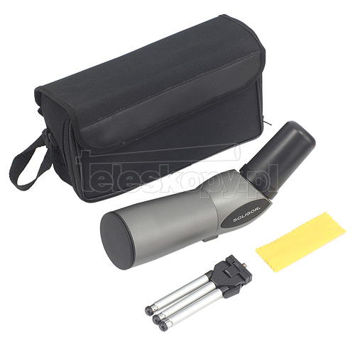 Luneta Soligor 12-36x50 Mini Zoom. Zgrabny refraktor do obserwacji przyrody, ptaków, bardzo dobry do obserwacji zawodów sportowych (z ręki przy powiększeniu 12x), doskonały do strzelectwa (obserwacja tarczy na odległościach 25, 50 i 100 metrów. Okular ustawiony pod kątem 45° (pryzmat Amiciego). Wysoka jakość optyczna. W zestawie z pokrowcem i statywem stołowym (do postawienia na parapecie, masce samochodu lub stole). Można postawić na dowolnym statywie fotograficznym ze standardową śrubą mocującą 1/4 cala.