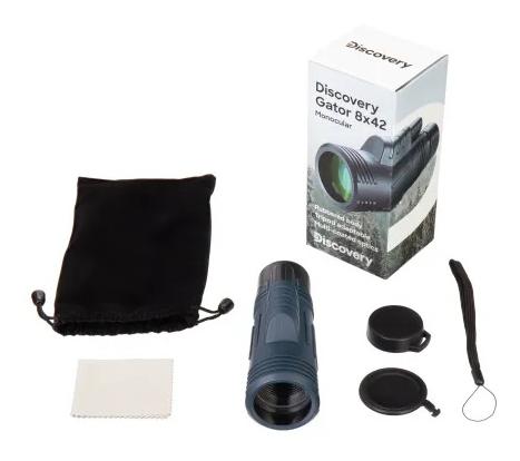 The body is made of ABS plastic and finished with rubber that improves grip, so the monocular always fits securely and comfortably in your hands. • wide-angle optical system with eight-fold magnification and a BK-7 glass prism • lenses fully multi-coated • wide range of diopter adjustment • body made of durable ABS plastic • magnification: 8x • Lens diameter: 42 mm • exit pupil distance: 19 mm • Exit pupil: 5.2 mm • field of view: 6.5° / 113 m @ 1000 m • minimum observation distance: 5 m • prism material: BK-7 glass • optical system coating: full multi-coating (FMC) • eyecups: twist-up • diopter adjustment range: ±4 • body material: ABS plastic • body finish: rubber • can be mounted on a tripod: yes • packaging dimensions: 180 x 80 x 70 mm • Levenhuk Discovery Gator 8x42 monocular • eyepiece and lens cover • cover • wrist strap • optics cleaning cloth • documentation 10-year manufacturer's warranty