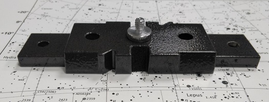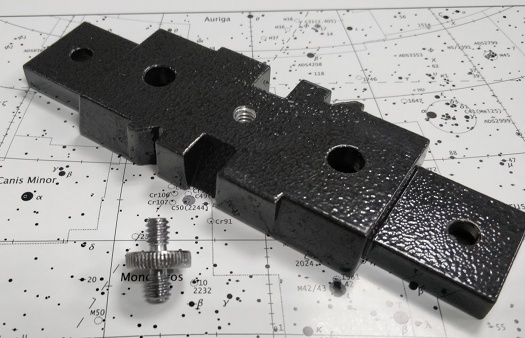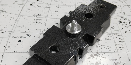Kupujemy śrubę typu 1/4" / 1/4" (na zdjęciach poniżej, mała srebrna) i adapter. Śrubę można kupić z kilka - kilkanaście złotych w sklepach foto, występuje także czasem w naszych szufladkach z różnymi różnościami na każdą (astronomiczną) okazję. Reszta wskazówek na zdjęciach poniżej. Po założeniu tuby na szynie - możemy tubę (lub inne akcesorium - np. aparat fotograficzny, lunetę czy lornetkę) zamocować na statywie astronomicznym z siodełkiem dovetail żeńskim ("na wpust"). Nie jest to jedyna metoda - można w otwory na końcu szyny przykręcić obejmy i w ten sposób zamocować inne tuby, nie posiadające wyjścia foto. Poniżej jest więc pokazana podstawowa, typowa - lecz nie jedyna - koncepcja użycia.