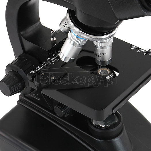 Pokrętła zgrubnej i dokładnej regulacji ostrości pozwalają na precyzyjne ustawienie preparatu.