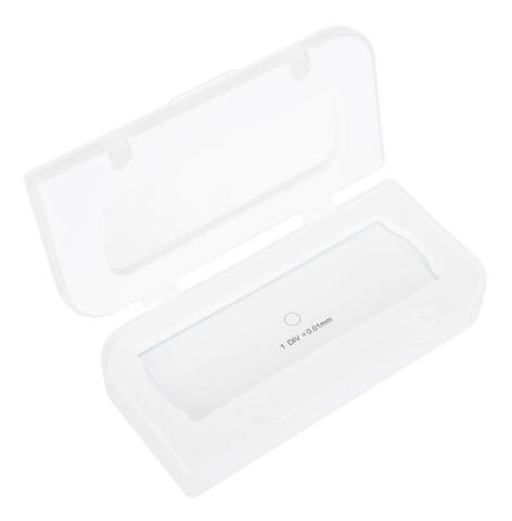 Szkiełko Levenhuk 1 opracowane zostało z myślą o kalibracji oprogramowania do analizy obrazu mikroskopowego. Wyposażone zostało ono w skalę mikrometryczną o długości 1 mm (100 podziałek).