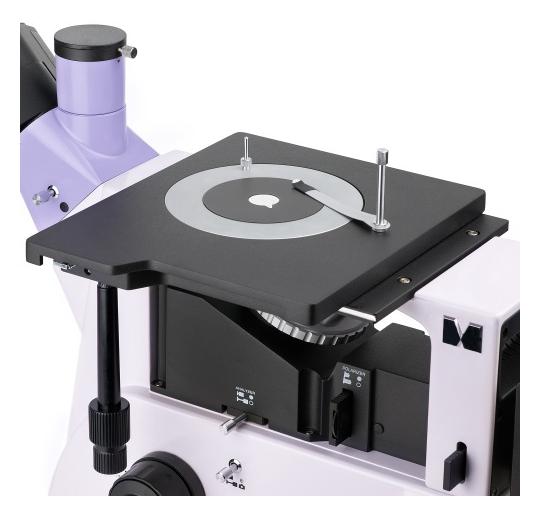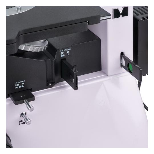 • badanie dużych i ciężkich preparatów metodami jasnego pola i polaryzacji • duży stolik i wymienne, obracane płytki z otworami Ø10 mm, Ø20 mm i Ø30 mm • głowica trójokularowa z możliwością obrotu o 180° • montaż kamery i monitora: boczne gniazdo w korpusie (100:0/0:100) i trzecia tuba w głowicy (50:50 i 100) • halogenowe oświetlenie odbite 30 W z regulacją jasności, ustawieniem Köhlera, filtrami barwnymi • wyjmowany analizator i polaryzator • bogaty wybór dodatkowych akcesoriów: okulary, obiektywy, kamery, preparaty kalibracyjne