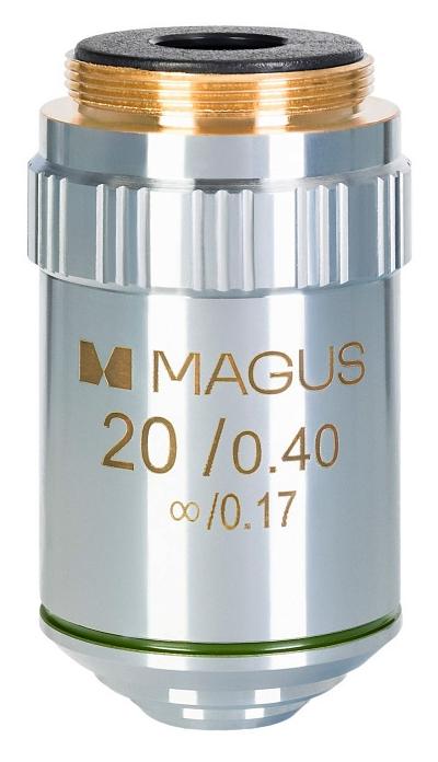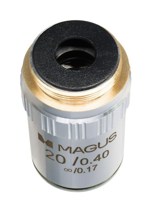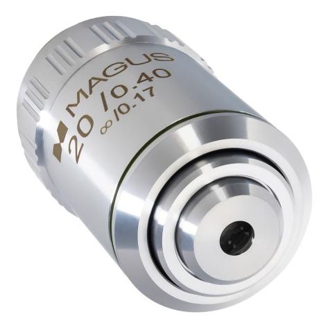 Obiektyw MAGUS MA20 20x/0,40 może być używany z okularami o powiększeniu od 10x do 20x. Obiektyw koryguje aberrację chromatyczną dla koloru niebieskiego i czerwonego, zniekształcenia sferyczne dla koloru zielonego oraz krzywiznę pola dla 65% średnicy pola widzenia. Podczas obserwacji należy używać szkiełka nakrywkowego o grubości 0,17 mm.