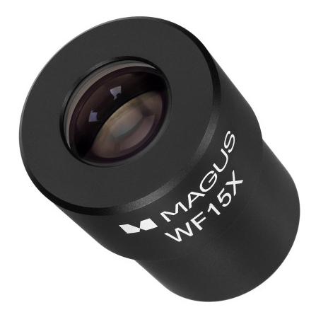Okular o powiększeniu 15x jest odpowiedni do obiektywów o powiększeniu 4x, 10x, 20x i 40x. Konstrukcja przystosowana jest do tuby o średnicy 30 mm. Model nie posiada regulacji dioptrii – w przypadku konieczności dostosowania ostrości do indywidualnego wzroku zaleca się korzystanie z mikroskopu wyposażonego w pierścień regulacji na tubie. Odstęp źrenicy wyjściowej wynoszący 10 mm umożliwia wygodne prowadzenie obserwacji również w okularach korekcyjnych.
