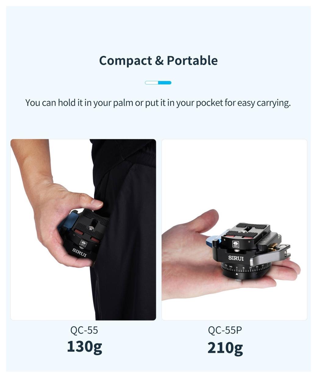 Płytka montażowa QC-55P po zamontowaniu na statywie umożliwia prowadzenie panoramowania w pełnym zakresie 360°. Dodatkowo na bocznej powierzchni płytki naniesiona została skala, ułatwiająca określanie zakresu obrotu aparatu. W skład systemu mocowania wchodzi również płytka montażowa w standardzie Arca-swiss mocowana do aparatu lub kamery za pomocą standardowego gwintu 1/4"-20.