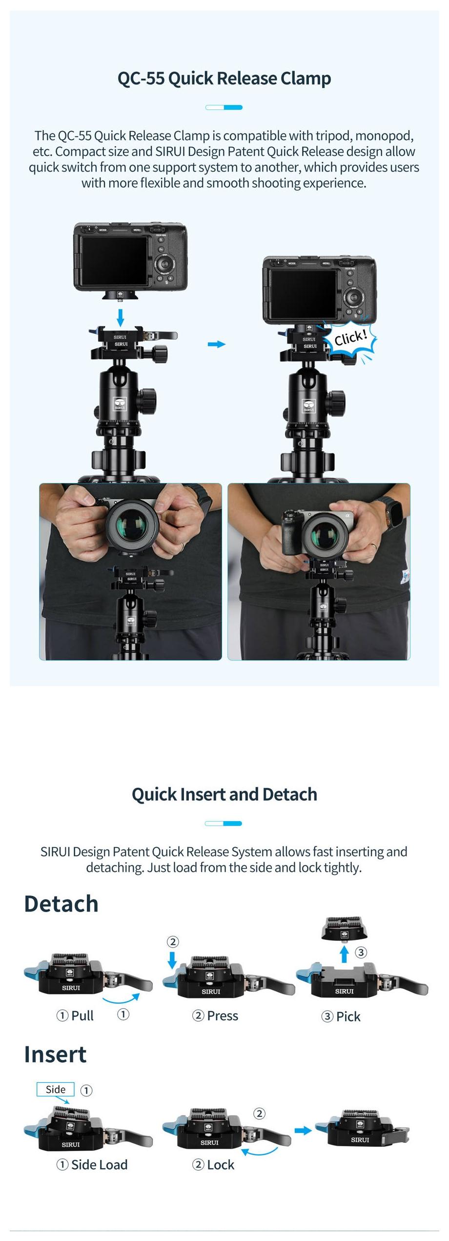 Sirui QC-55P to bajecznie prosty w montażu i użyciu kompletny system mocujący aparaty i kamery do statywów.