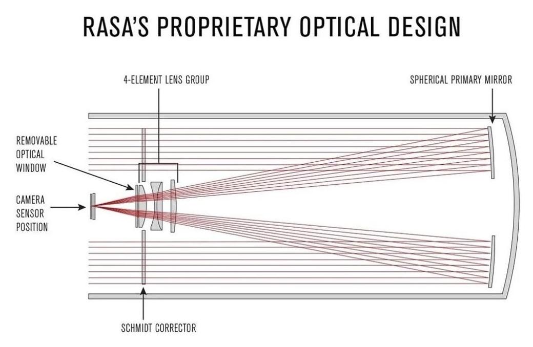 RASA 11 V2 posiada optykę z 4-elementowym szkłem z metali ziem rzadkich. Pozwala to uzyskać obraz wolny od komy i krzywizny pola z wiernym odwzorowaniem kolorów. Jakość optyczna i rozmiar plamki w całym kręgu obrazu są bezprecedensowe dla astrografu w tym przedziale cenowym. Ta konstrukcja optyczna zapewnia również minimalne winietowanie.