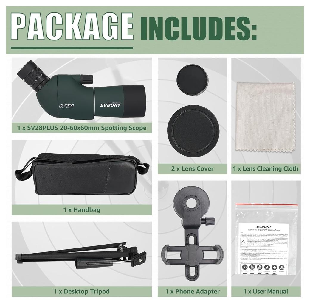 Luneta obserwacyjna Svbony SV28 PLUS 15–45x50 (SKU: F9308H) to kompaktowy model w zielonej wersji kolorystycznej, wyposażony w statyw stołowy oraz adapter do smartfona. Dzięki zmiennemu powiększeniu 15–45× i obiektywowi o średnicy 50 mm doskonale sprawdzi się w podstawowych zastosowaniach terenowych i rekreacyjnych.