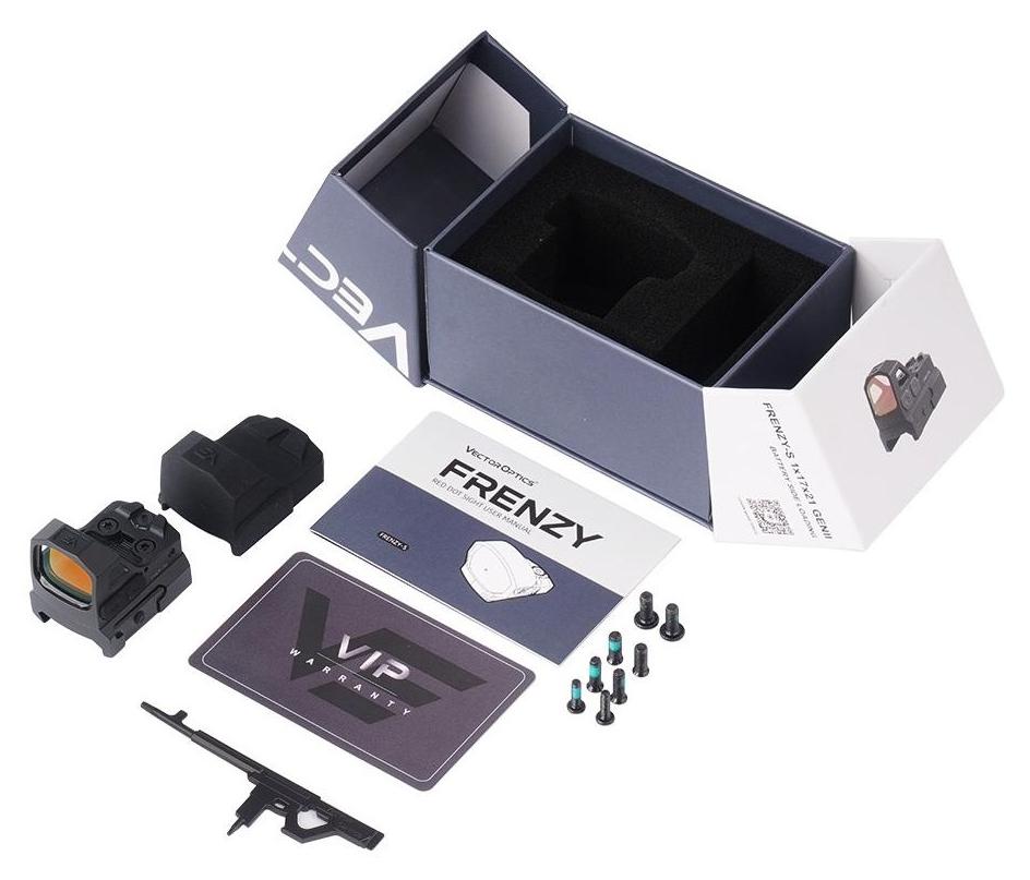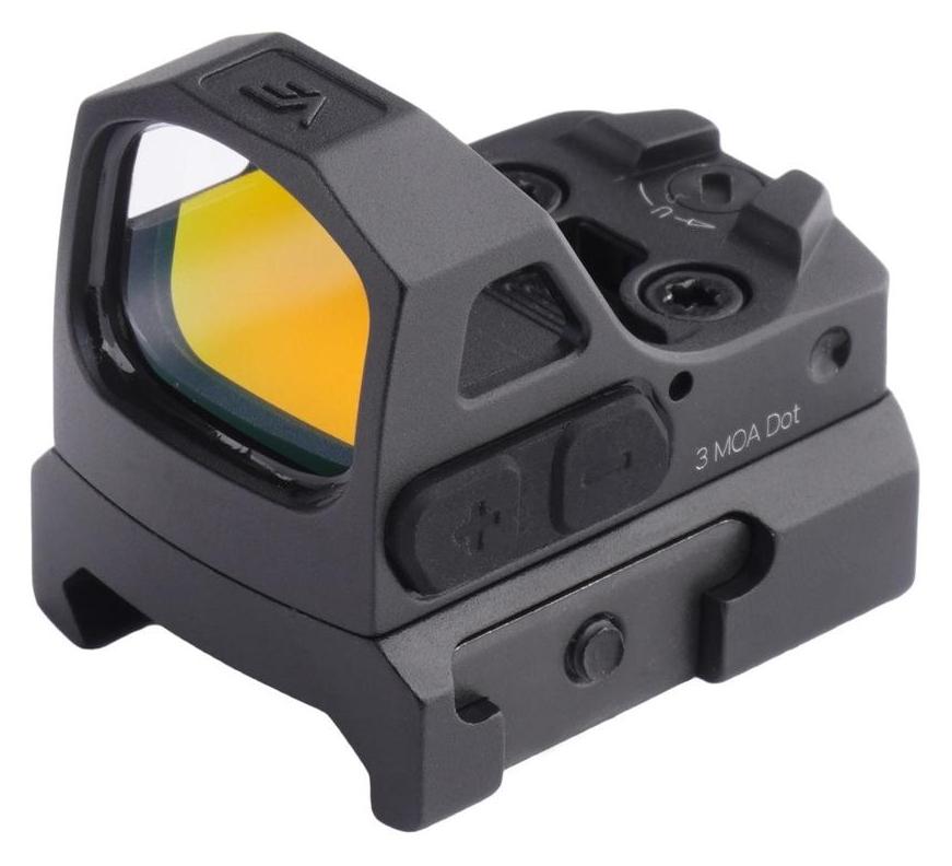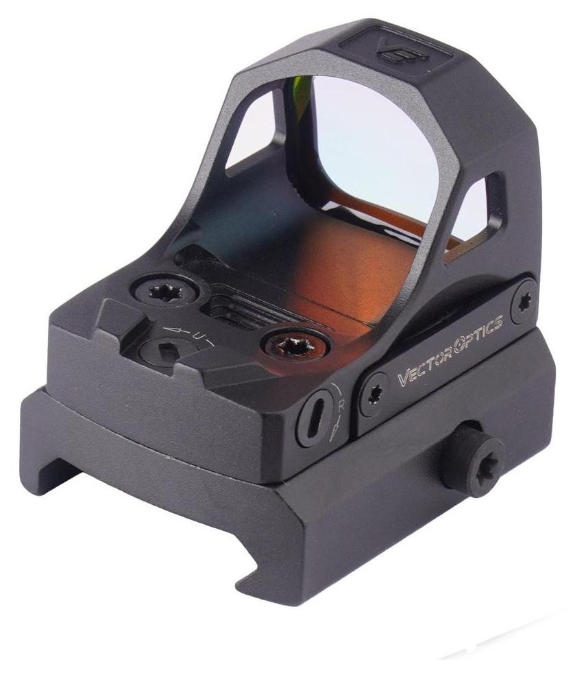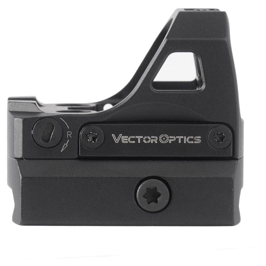 Kolimator otwarty Vector Optics z zakrzywioną soczewką i czerwoną kropką celowniczą o wielkości 3 MOA. Solidna konstrukcja z aluminium 7075 T6 oraz klasa szczelności IPX7 pozwalają na użycie w różnych warunkach, także podczas dynamicznego strzelania. Kolimator wyposażono w 8 poziomów jasności punktu oraz 2 poziomy trybu nocnego, a zasilanie zapewnia bateria CR1632 z czasem pracy do 50 000 h.