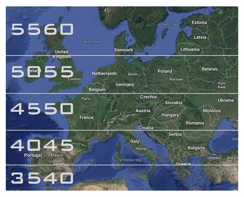 • komplet segmentów geograficznych dla zakresu 50°–55°