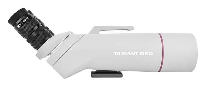 Lornetka astronomiczna Sky Rover Optics 70 mm GIANT BINO 45° to kompaktowy instrument obserwacyjny przeznaczony do obserwacji astronomicznych oraz przyrodniczych. Obiektywy o średnicy 70 mm i ogniskowej 400 mm zapewniają jasny obraz oraz dobrą widoczność szczegółów przy zachowaniu niewielkiej masy i poręcznych wymiarów. Konstrukcja z okularami ustawionymi pod kątem 45° umożliwia wygodną obserwację obiektów znajdujących się wysoko nad horyzontem.